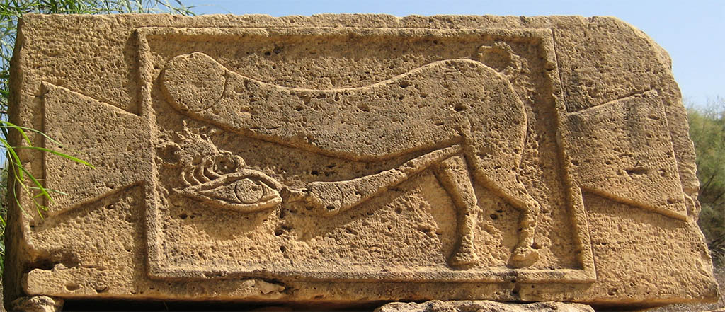 At Leptis Magna in Syria a doubly-apotropaic sculpture has been unearthed: a bull-legged phallus whose penis is squirting semen into (blinding) a vaginesque Evil Eye which is carrying or being devoured by a ?scorpion.